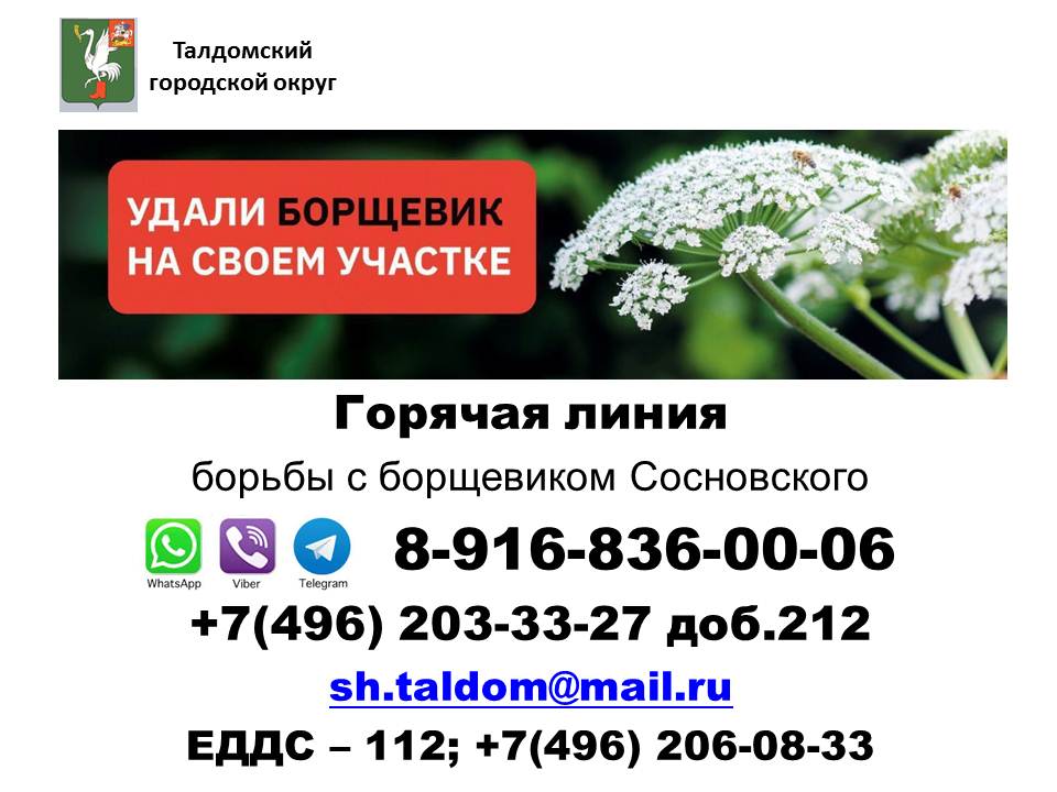 На территории Талдомского городского округа начала работать горячая линия по борьбе с борщевиком Сосновского. Узнать о методах борьбы с борщевиком, сообщить о местах произрастания сорняка и получить сведения о плановой обработке пораженных сорняком территорий Талдомского городского округа можно по телефону горячей линии: 8-916-836-00-06. Также можно позвонить на телефон 112 либо 8-496-203-33-27, доб.212