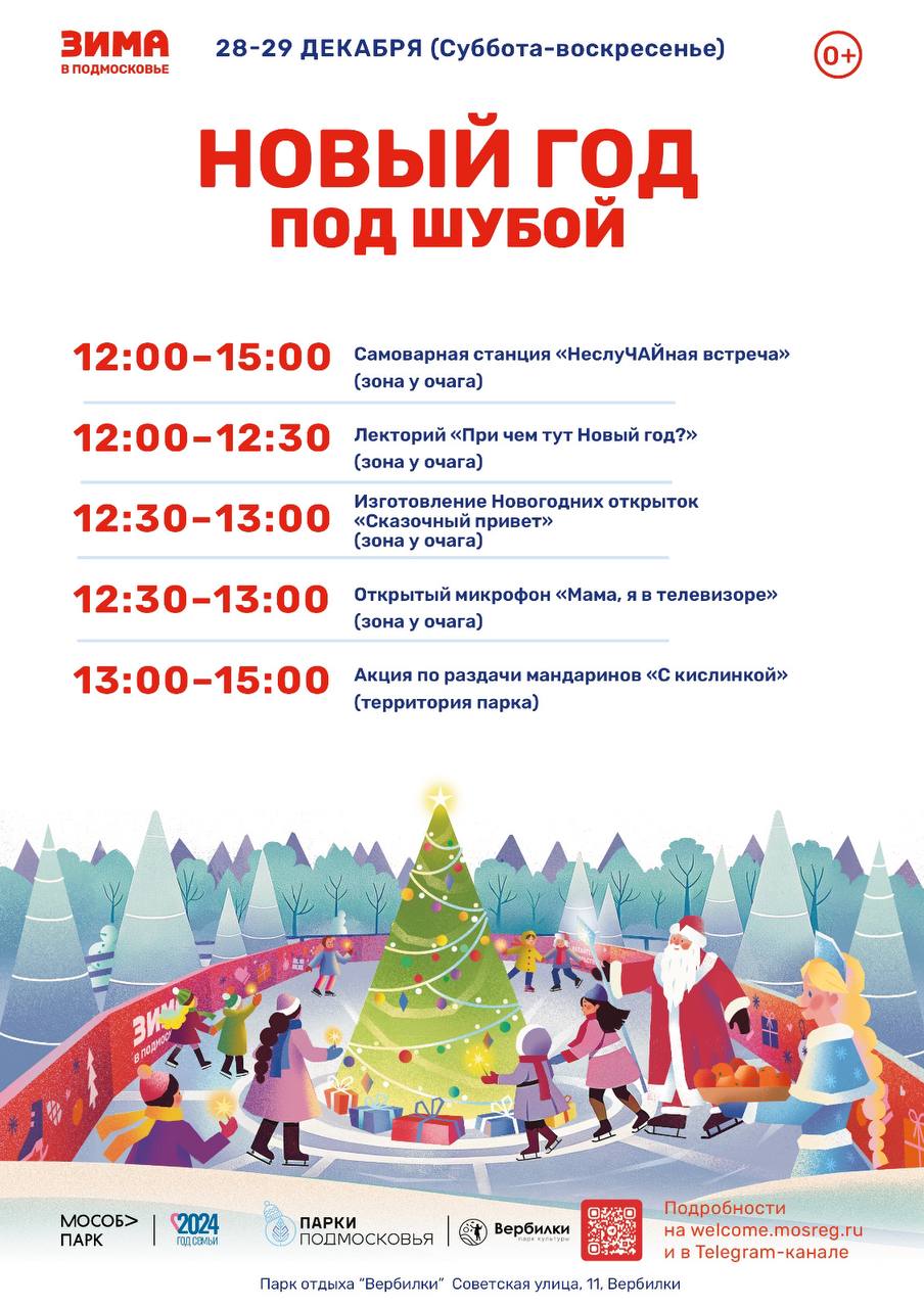Парк «Вербилки» приглашает своих друзей 28 и 29 декабря с 12.00 до 15.00. Гостей ждет открытый микрофон «Мама, я в телевизоре», мастер-класс по изготовлению новогодних открыток, занимательный лекторий «Причем тут Новый год?»